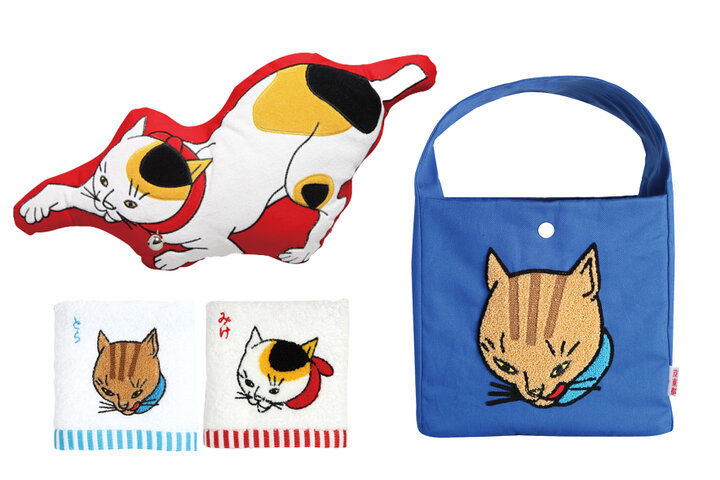 左上:ぬいぐるみ みけ 右:猫ミニバッグ とら 左下:ハンドタオル とら/みけ <京東都>(イーストヤード4階) ※通年販売商品 獲物を狙う三毛猫の「みけ」と赤い舌をぺろりと出す「とら」の猫グッズ。刺繍がかわいいワンハンドルのミニバッグは、お弁当を入れるランチバッグや、サブバッグとしてもオススメです。