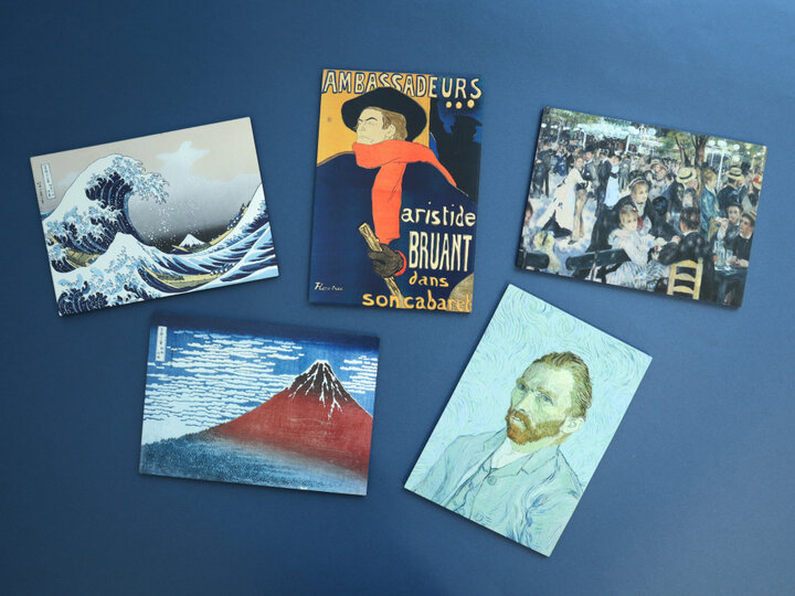 「PENONタッチミー!ポストカード」は、紙製ポストカードでは表現できなかった原画のキャンバスの質感を緻密な凹凸で表現した木製の立体ポストカードです。 端材や廃材を再利用資源にしたサステナブルな木材を使用しており、日本国内であれば120円切手でそのままポスト投函も可能です。 ポップアップ先行発売の新作5柄を含む、全17柄を取り揃えています。 (写真) PENON タッチミーポストカード (上段左から)葛飾北斎「神奈川沖浪裏」、ロートレック「アリスティード・ブリュアン」、ルノワール「ムーラン・ド・ラ・ギャレットの舞踏会」、葛飾北斎「凱風快晴」、ゴッホ「自画像」