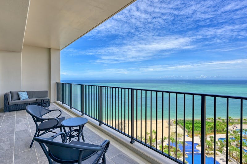 340室の客室は、全室がテラスを備えたオーシャンビューとなっており、移り変わる海の風景を1日中楽しむことができます。3Fから11Fのスーペリアフロアは、利便性が高く、快適なデザインの客室になっており、12Fから14Fのクラブフロアは、ホテルに籠ってゆっくりと過ごすことができる、専用のラウンジやインフィニティプールを設けています。