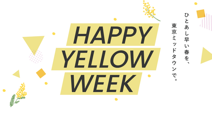 2023年3月1日(水)~3月12日(日)、東京ミッドタウンの館内を「YELLOW」で彩り、ひとあし早く“春”の訪れを感じていただく演出「HAPPY YELLOW WEEK」を初開催。 インフォメーションではアテンダントがミモザをつけてお出迎え。館内では草月流の女性アーティストによる黄色い花であしらわれたフラワーディスプレイが登場するほか、館内のお花や商業エリア入口のライトアップも黄色で彩られます。
