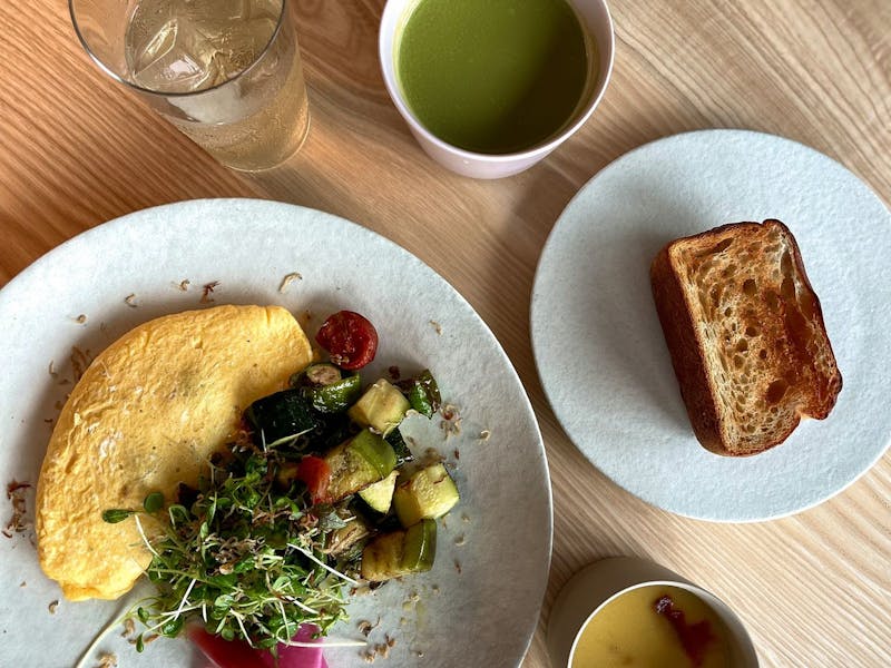 KISSA KISHINで味わえるボリュームたっぷりの朝食は、地元の農家から収穫された新鮮な季節の食材を使っています。毎日新鮮な有機野菜と放し飼いの卵を提供しています。