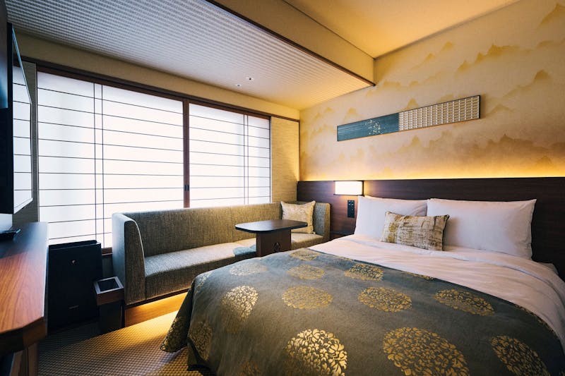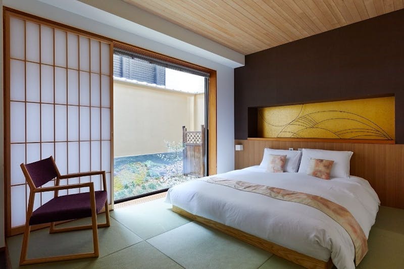 日本庭園「祇園」付コンフォートクイーンは、伝統と現代アートが絶妙のバランスで調和し、丁寧に仕上げられた空間。室内の床は名栗(なぐり)の板と畳で設えており、日本家屋の伝統を心地よく感じられます。また、部屋内からはゲストのためだけに造られたお庭を堪能できます。