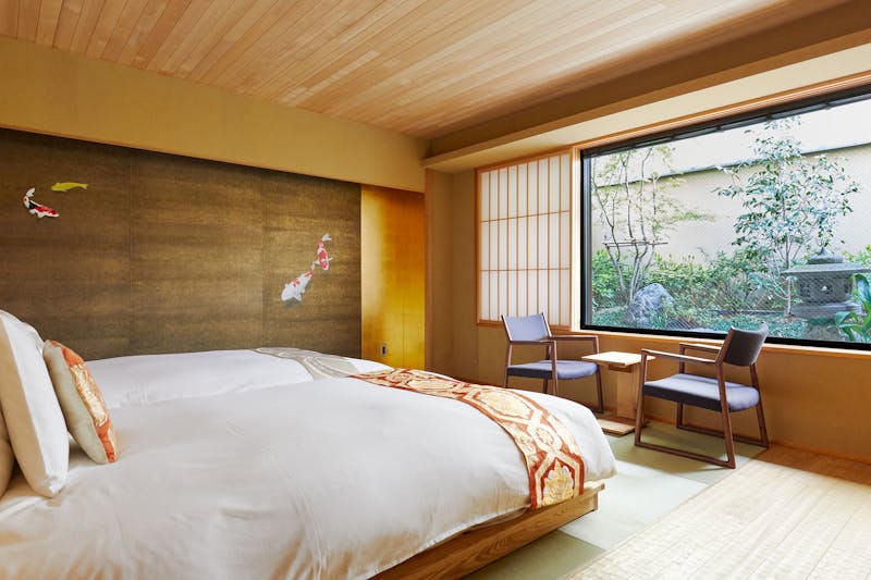ツインタイプの客室は畳のある伝統的な町家の雰囲気を楽しみながら、こだわりのアメニティ、設備を揃え快適さを提供します。 四季を感じるお庭を眺めながらくつろぐことができます。