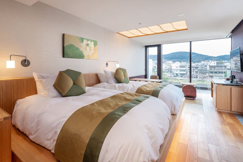 広々とした客室からはそれぞれ鴨川、東山連峰、京都市街、坪庭などの景色を望むことができます。ラグジュリアスなしつらえとインテリアに和の雰囲気があり、京都の職人さん手作りの家具が優雅な心地よさを加えます。