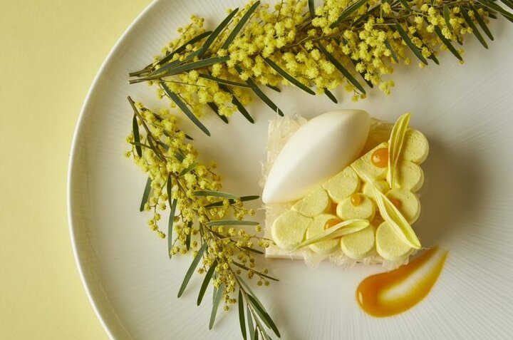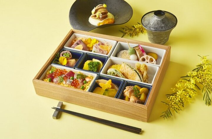 地元神奈川県で採れた旬の野菜の味覚と美しさを引き出した「黄色い野菜のボイルサラダ」や、ビタミンが多く含まれる黄色人参や南瓜などの「黄色い野菜の煮物」をはじめ、「ローストビーフの野菜巻き」など、栄養をバランスよく取り入れた、五感が喜ぶ品々をお弁当スタイルで用意。 デザートには、杏仁パンナコッタに山椒のチュイールにアプリコットのソースを添えて、黄色のエディブルフラワーをアクセントにして提供します。 日時 : 3月1日(水)~ 3月8日(水)