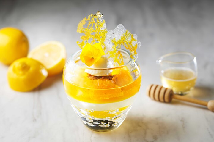 パルフェ ミエル ジョンヌ ※10食限定 レモンをメインにグレープフルーツやオレンジなどの柑橘フルーツとはちみつを合わせた、甘酸っぱい大人可愛いパルフェ。はちみつをかけて召し上がれ。