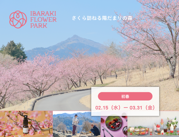 体感型の施設としてリニューアルした茨城・石岡の「いばらきフラワーパーク」では、旬の「桜」と「いちご」をテーマにした「さくら訪ねる陽だまりの森」シーズンを、2023年2月15日~3月31日の期間開催しています。 2月中旬の河津桜を皮切りに、3月中旬頃からソメイヨシノ、大島桜、山桜、八重桜と多彩な桜が5月頃まで咲き誇り、青空に映える筑波山を背景にお花見シーズンを長く楽しむことができるほか、いちご紅茶、ミルフィーユやパフェなど、収穫最盛期を迎えた地元のいちごをふんだんに使ったメニューが登場します。
