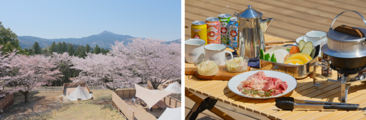 花やさと山の山頂エリアにあるグランピングエリアでは、桜と筑波山の山々を借景に日帰りBBQを開催しています。