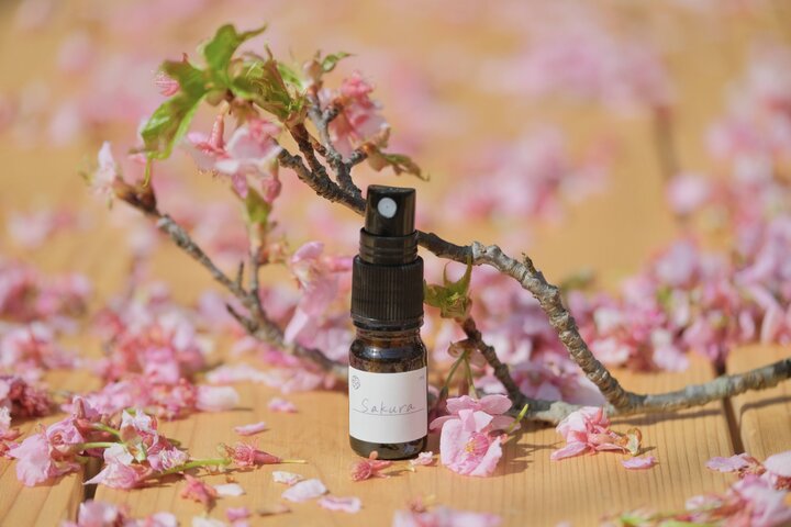 ■桜のアロマミスト作り 園内の桜を蒸留したボタニカルウォーターにお好みのアロマオイルをブレンドして、ルームミストを作ることができます。