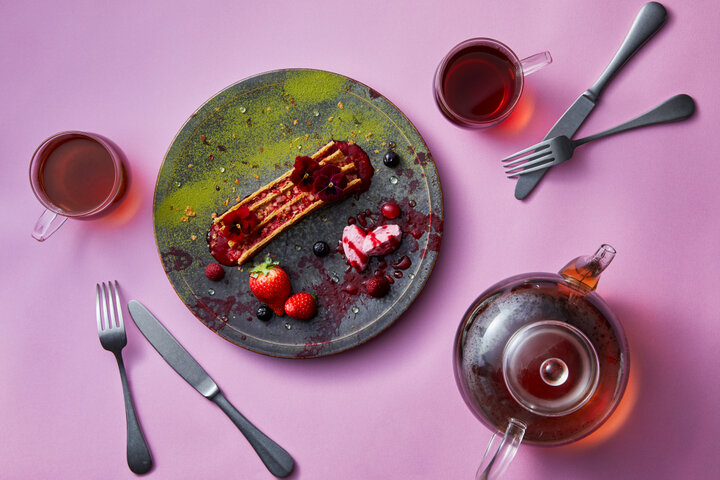 ■「八郷の苺ミルフィーユ」(スイーツ、ドリンク付き) 甘味だけでなく、酸味・塩味・旨味・苦味の五味を味わえる、自然豊かな八郷をイメージした華やかな一品。茨城の銘茶、猿島紅茶付きで提供しています。