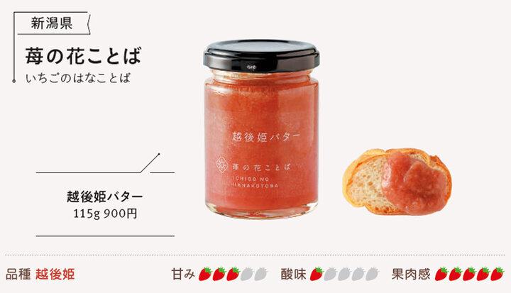 新潟県外にたった5%しか出回ることのないという「越後姫」を、ひと瓶に128gも使用。イチゴ農園メイドだから実現できるリッチなイチゴバターです。定植後化学農薬不使用、完熟の状態で収穫する「越後姫」の濃厚かつフレッシュな味わいが、ギュッと詰まっています。