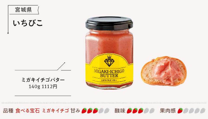 完熟もぎの濃くて甘い「ミガキイチゴ」と、まろやかなコクが魅力の宮城県産蔵王山麓バターをブレンド。パンにのせるなどの定番はもちろん、スープに隠し味として加えると味がランクアップ。イチゴスイーツ専門店「いちびこ」がイチゴ好きのために作った自信作です。