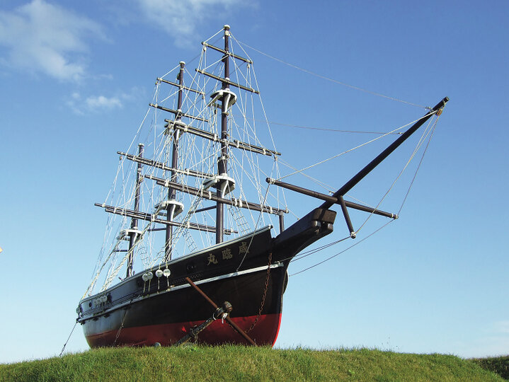 約1/5のスケールで再現された咸臨丸。1871年(明治4)年に、仙台から箱館経由で小樽に向かう途中にサラキ岬沖合で座礁。数日後に破船沈没した