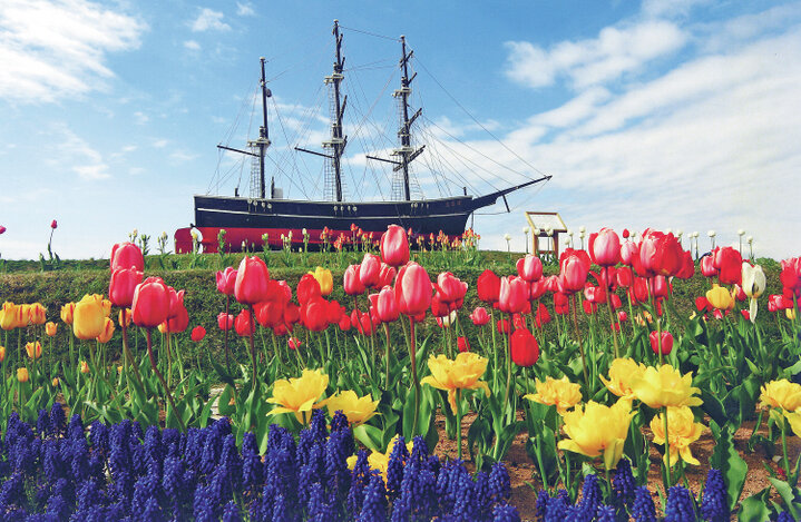 木古内駅から車で10分の「サラキ岬」。この岬の沖合には幕末の軍艦・咸臨丸が沈んでいるとされ、終焉の地としてその歴史と功績を語り継いでいます。5月には、咸臨丸がオランダで建造された縁で植えられた色とりどりのチューリップが満開になります。
