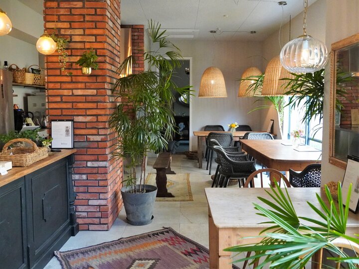 赤レンガやシャンデリアなど瀟洒なヨーロピアンスタイルの中にアンティークの鏡やテーブルをおしゃれに配置したお店は、オーナーの高橋須賀子さんのセンスでオリエンタルなムードにも包まれています。フランスの影響を強く受けたベトナムが好きで、そのイメージでこのお店をデザインしたのだそう。所々に置いたナチュラルな色合いのカゴもアクセントに。