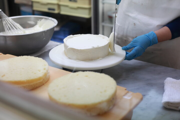 豊橋駅東口を出て徒歩5分。豊橋駅前商店街の中にある「マッターホーン」は、50年近い歴史を持つ洋菓子店。お菓子を作る工房とショップ、カフェがひとつになった店舗となっていて、扉を開けると、カスタードやスポンジの甘い香りが漂います。ショーケースのすぐ横には厨房があり、ケーキを仕上げるようすを見ることも。売れ行きを見ながら作り上げ、なるべく出来立てで提供できるようにしているそうです。