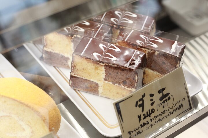 「マッターホーン」では、30種類以上のケーキが並んでいますが、昭和のケーキを知る世代に愛されているのが、バタークリームを使ったケーキ。初代店主の河合さんは東京・学芸大学前に店を構える「マッターホーン」で修業し、のれん分けという形で豊橋にお店を開いたのだそう。東京の「マッターホーン」の名物である、バタークリームを使い市松模様にスポンジを組み合わせたケーキ「ダミエ」も、少し改良を加えて作り続けています。