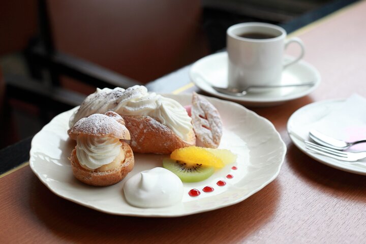 ショップの奥にはカフェスペースがあり、モーニングタイムにはコーヒーをオーダーするだけで、その日のおすすめのケーキや焼き菓子が付いてきます。午後は好きなケーキが選べるデザートセットを。自家製のシャーベットや焼き菓子、フルーツなどと一緒に豪華な皿盛りデザートに仕上げてくれますよ。