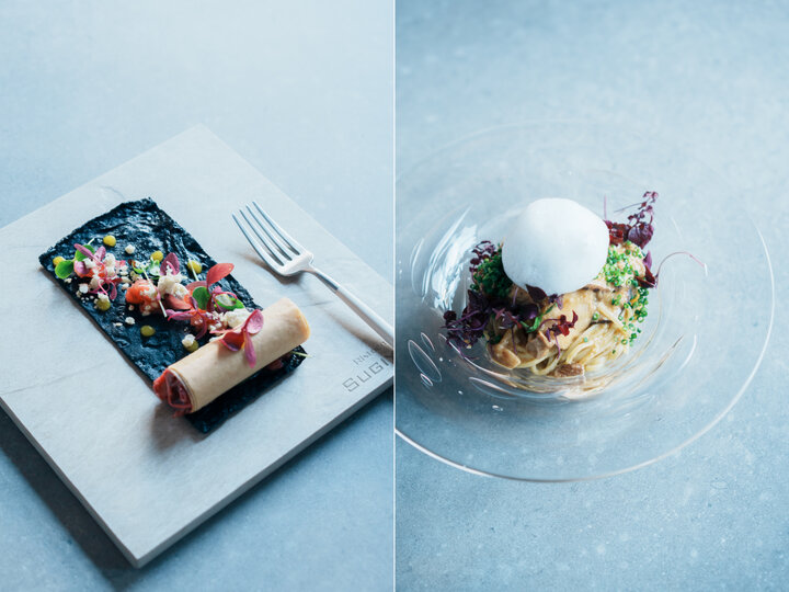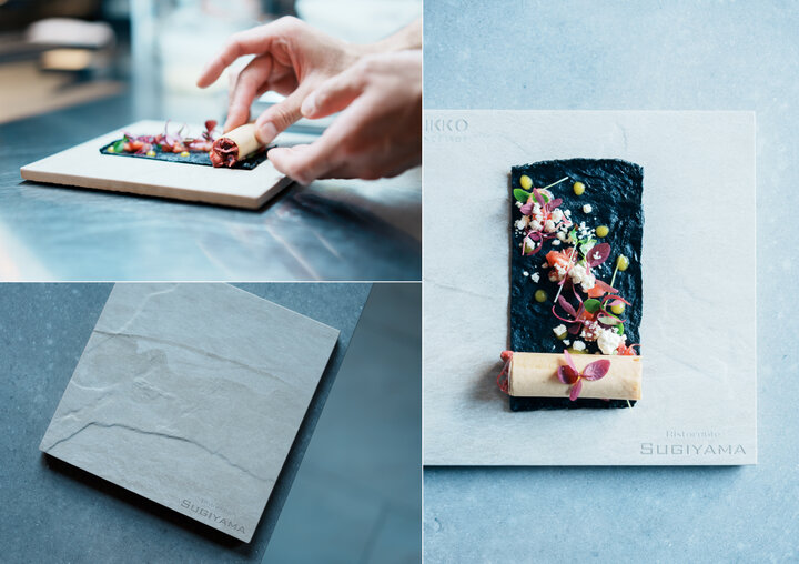 「Ristorante SUGIYAMA」のランチは3種類。気軽に楽しめるパスタコースと、メインの肉料理が追加されたコース。さらにグレードアップメニューも用意され、シーンや一緒に訪れる相手に合わせて選択できます。それぞれに前菜が数品。この日、その中の一つとして提供されたのはマグロのタルタルをつめたパートブリックです。黒いクレープを、直に手で巻いて頂きます。 この料理に使用される店舗ロゴの入った器は、石川県に本社を置く陶磁器メーカー「NIKKO」とのコラボで生まれたもの。廃棄タイルをアップサイクルしたサスティナブルな食器です。この器から着想を得て、料理のクレープ生地には、以前は廃棄されていた焼き茄子の皮が使用されているといいます。見た目の華やかさだけでなく、今の時代をとらえた、ストーリーのある一皿です。