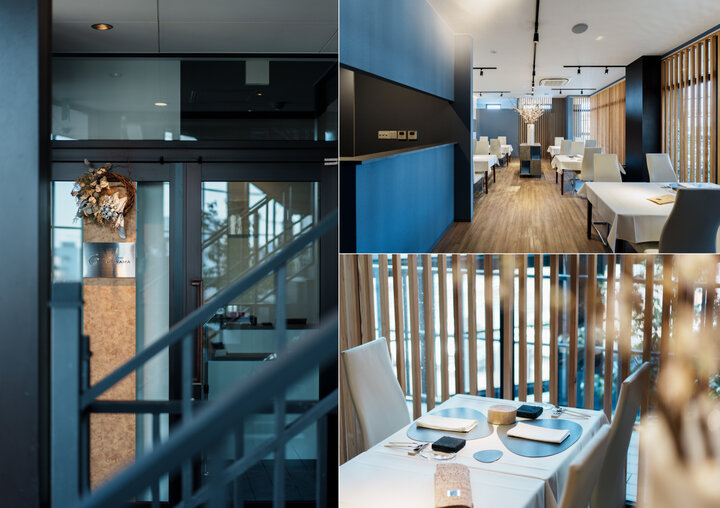 入口の扉を開け、厨房の横を通って案内されたのは窓からの光が差し込む明るい空間。ブルーとホワイトを基調とした爽やかな印象です。加賀五彩の一つでもある藍色の壁には通常和食店で使われるような和紙の壁紙を使用しているといいます。全体を和の趣が主張しないデザインにすることでイタリアンレストランの空間として成立し、その斬新な雰囲気が食事への期待を膨らませていくようです。