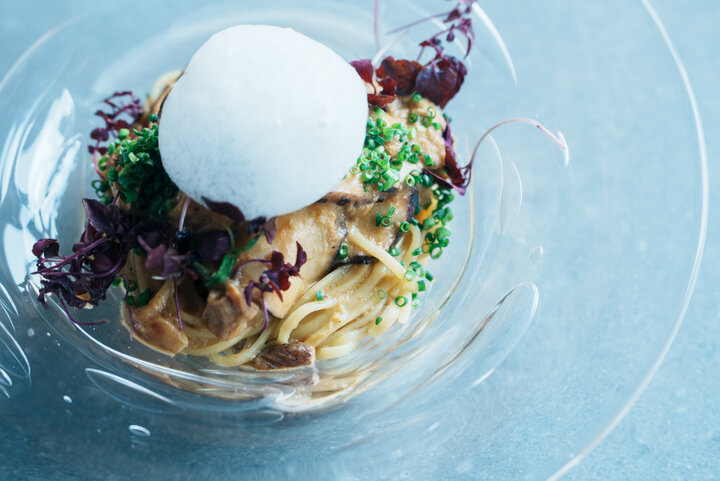 美しい気泡の入ったガラスの器に盛られたのは、石川県の奥能登で栽培される大きな原木しいたけ「のとてまり」を使った温製のパスタ。元の大きさが分かるようスライスされたしいたけは、そのサイズ感だけでなく食感や凝縮された旨みにも驚くはずです。仕上げにのせたシジミの出汁の泡で更に旨み成分をプラスした豊かな味わいのパスタに心躍ります。