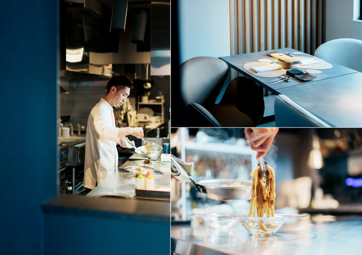 同店の店主、杉山裕太郎さんは金沢市出身。幼い頃にイタリアンのシェフになりたいと決意した杉山さんは人生の様々な場面で、自身でレストランを営むことを主軸にあらゆる選択をしてきました。高校時代には“料理人になるために”デザイン科のある学校へ進み、自身のアートセンスを磨いたとか。当時学んだプロダクトやインテリアデザインの知識は、料理でも大切なものづくりにおける構成力や色彩感覚が身についただけでなく、店づくりをする上での設計や空間づくりにも生かされています。