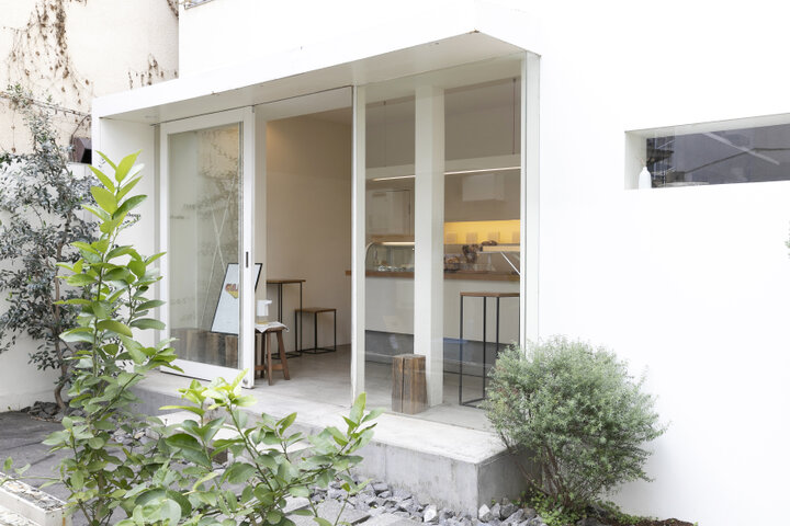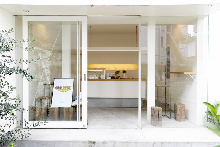 おしゃれな店が点在する代々木公園界隈の、ちょっと奥まったところに店を構えるAfterhours。住宅街の表通りから路地に入り、飛び石が並ぶアプローチを進んだ奥に、入り口があります。店内は、コンクリートの床に白い壁、奥のカウンターからイートインスペースのテーブル、椅子にいたるまで、装飾を削ぎ落とした平面で統一された、スタイリッシュな空間です。 ケーキは、店主の横田愛さんが作りたいと思うものが、週替わりで3〜4種類ずつ登場。すべてのケーキにおいて、自分が食べておいしいと思った材料を使い、余計な装飾は加えずに、できるだけシンプルにしたいと考えているそう。