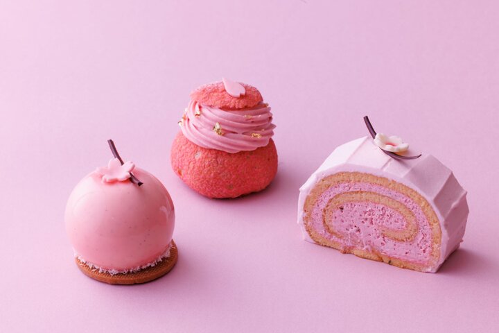 ■グリオットチェリーとバニラムース(写真左) 甘酸っぱいグリオットチェリーのムースをバニラムースで包み込みました。チェリーのムースに入ったクリスプが食感のアクセントになっています。 ■チョコレートと桜のシュークリーム(写真中) チョコレートクリームと桜のクリームを重ねた春色のシュークリームです。クリーム中央には、しっかりした酸味が特徴のイタリア産アマレナチェリーが一粒。さりげなく金粉もあしらいました。 販売期間:4月10日(月)まで