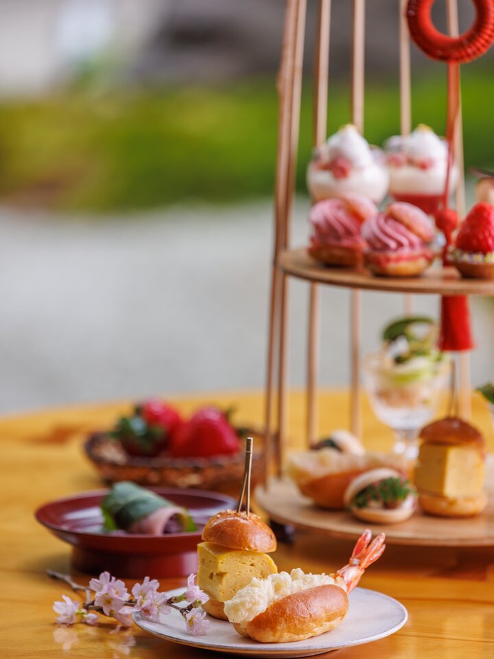 3月から提供している東山 桜アフタヌーンティーは京都がひときわ美しくなる桜の季節に合わせて、春の食材をふんだんに使ったセイボリーとスイーツが、ティータイムを華やかに演出します。 セイボリーは、春野菜のカクテル寿司、ぷりぷりの海老天を自家製バンスで挟んだ注目の海老天婦羅ドッグ、だし巻バーガー、蕗の薹味噌を効かせたフォアグラムースとソイフルーツの最中などを楽しむことができます。 スイーツには、春色が可憐な桜と小豆のシュークリームや苺のタルトなどを。また甘味には、薄く焼いた生地に丹波大納言を使った餡を巻いた関東風さくら餅を抹茶と共に提供しています。 実施期間:4月30日(日)まで