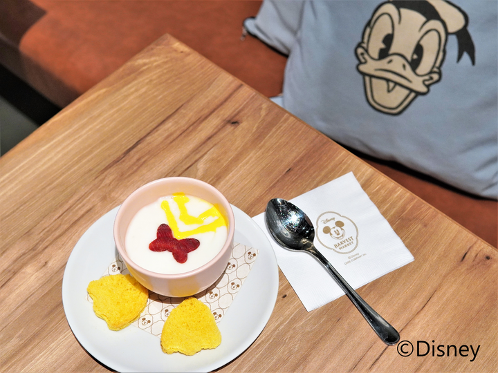 季節のアフタヌーンティーなどのほか、横浜赤レンガ店限定のアラカルトにはドナルドダックをフィーチャーしたクラムチャウダーなどの楽しいメニューも。水かきに見立てた黄色のクルトンがキュートです。