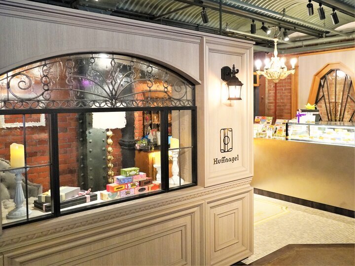 横浜土産としてロングセラーを続けるレーズンサンドの「かをり」から誕生したパティスリーブランド「Huffnagel(フフナーゲル)」。クラシカルなホテルのロビーを思わせるショップはシャンデリアがほんのり灯り、異国情緒も漂います。
