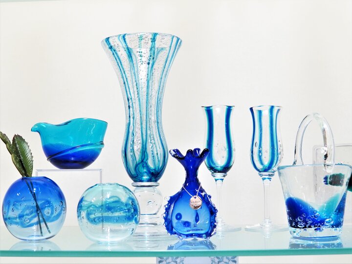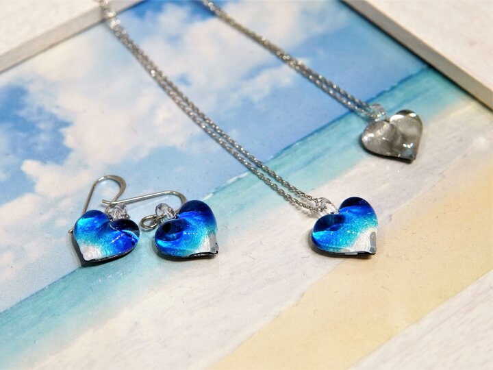 飾っておくだけでも爽快感のあるカラーが特徴で、細身のシャンパングラスやお皿などのほか、ブルーのグラデーションがさわやかなネックレスやピアスも素敵です。手づくりのため一つずつ微妙に異なる作品の中からお気に入りをぜひ見つけて。