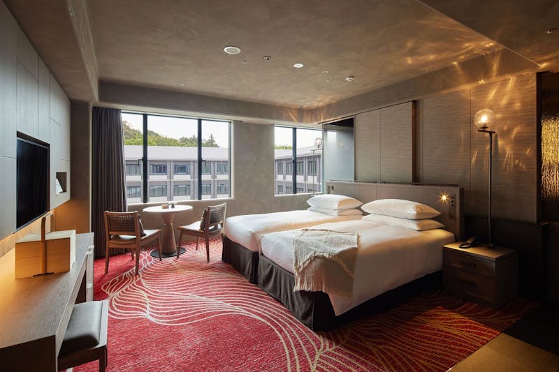 客室のインテリアデザインは白川の水の流れやゆらぎなどをイメージし、和と洋のエッセンスをかけあわせて、落ち着いた空間を演出しています。部屋でゆっくり過ごす時間をサポートするアイテムも魅力の一つです。