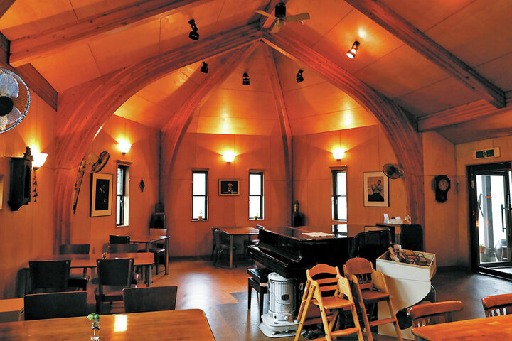 音楽ホールをイメージして建てられた。ジャズが流れる店内にはピアノも置かれている