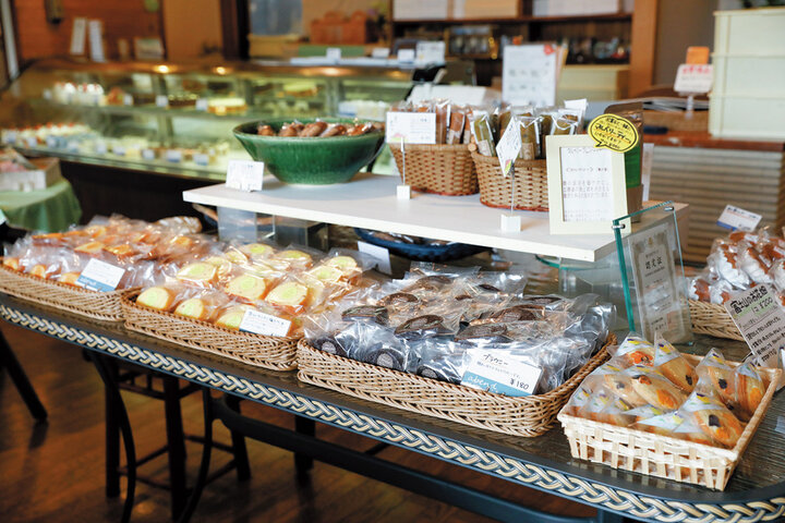 約20種類のケーキや富士登山の杖をイメージしたフィナンシェ「つえ」など焼き菓子が並ぶ