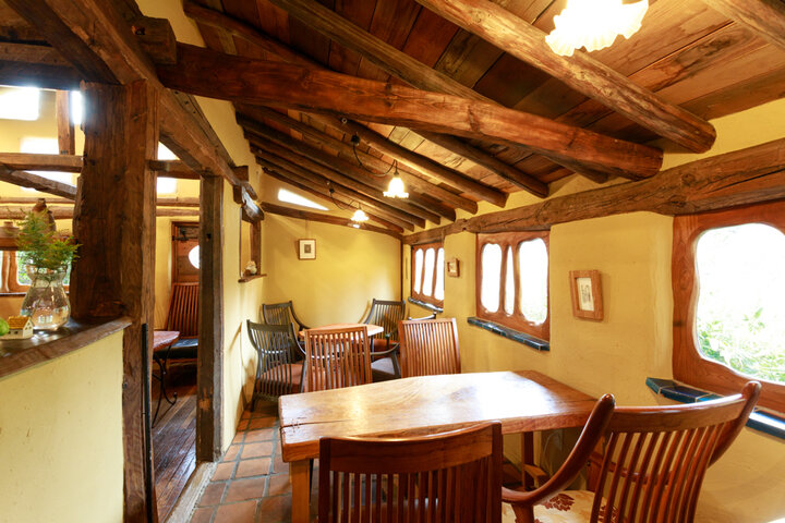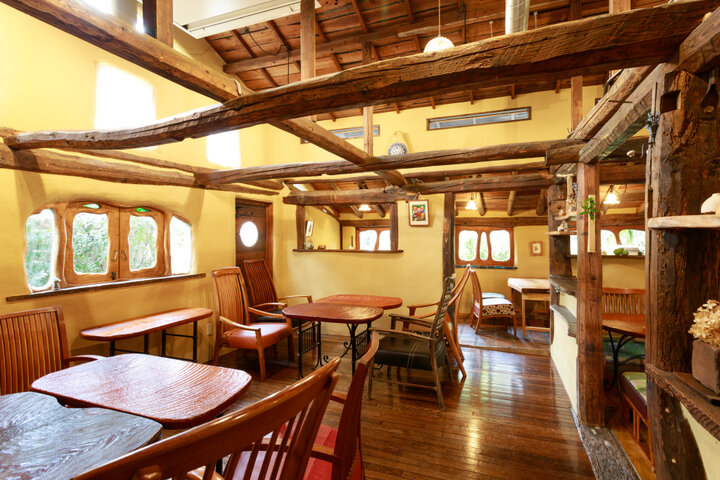 京壁に藁を混ぜて塗った明るいアースカラーの壁や曲線を描くガラス窓など、手作りならではの有機的なフォルムが特別なくつろぎ感を演出。古い柱や梁をそのまま生かした店内はとても居心地がよく、まるでイタリアの片田舎のレストランを訪れているような気分になります。