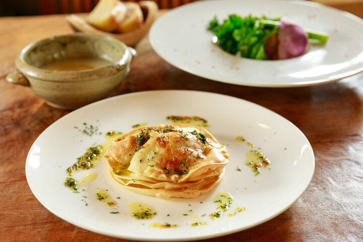 ランチは3種類のコースを用意。デザートまでしっかり食べたい人には前菜とスープ、手打ちパスタ、デザート、ドリンクが付く「灯コース」2450円がおすすめです。 手打ちパスタは3種類の中からお好みをチョイスできます。訪れた日は、笹本さんがイタリア修行時代に教わったというパリパリのラザニアのほか、ピリ辛トマトソースのタリアテッレ、イナダとほうれん草のクリームソースのタリアテッレというラインナップでした。