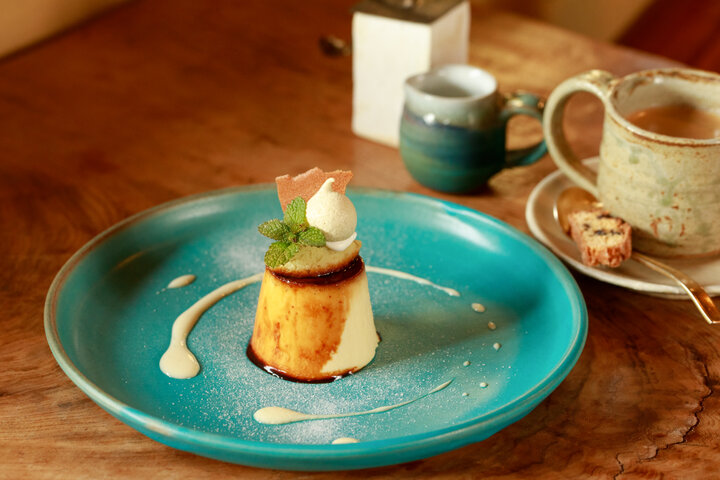 プリンに乗っているのはさつまいものクリーム、お茶と柚子のメレンゲ。地元で栽培している茶葉を手もみで製茶してメレンゲに加えている