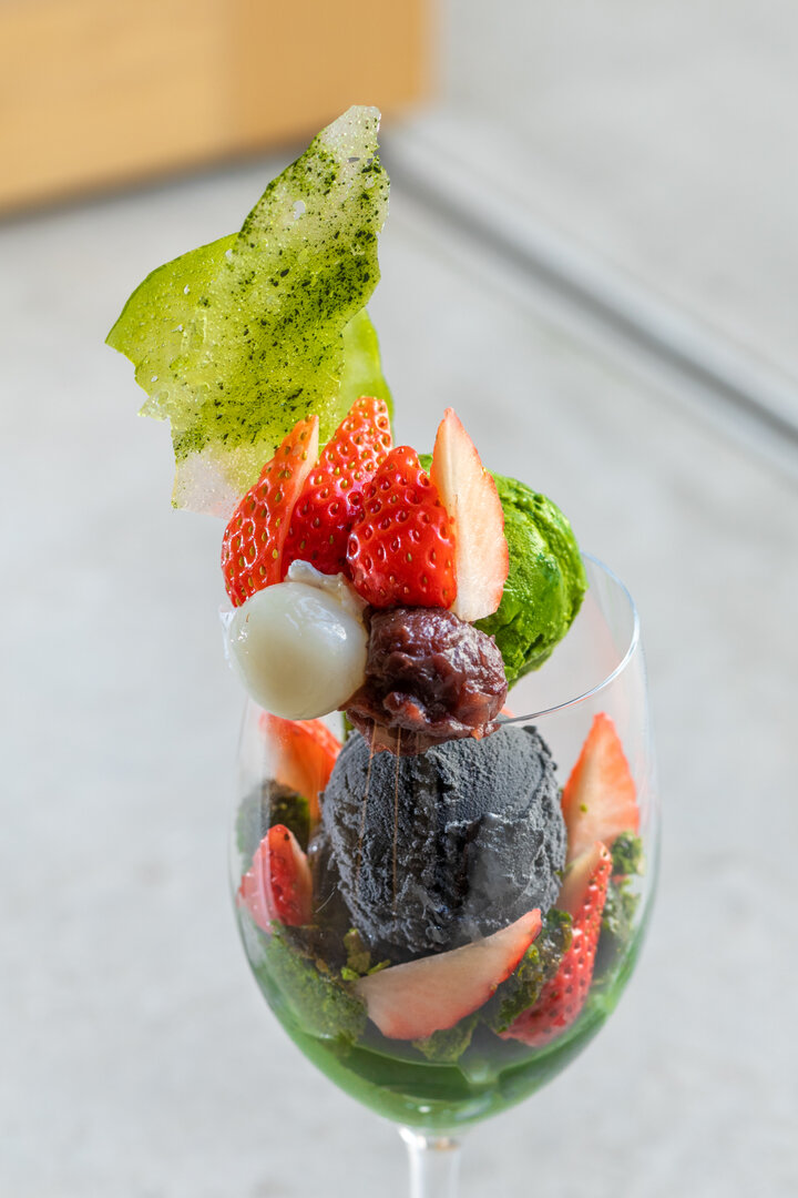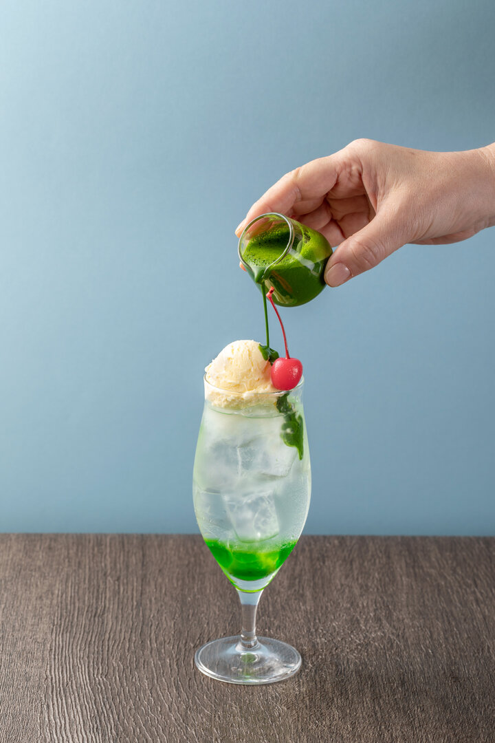 夏の定番ドリンク・クリームソーダにあっと驚く抹茶バーションが登場。鮮やかなメロンシロップに冷たいサイダーを注ぎ、バニラアイスクリームとチェリーをトッピング。そんないつものクリームソーダに、山政小山園の本格宇治抹茶を注いでいただけます。 甘いシロップとほろ苦い抹茶、ひんやりとしたバニラアイスのマリアージュは、ここでしか味わえないスペシャルな美味しさです。 このほか、黒胡麻MATCHAの抹茶パフェ、MATCHAカッサータなどのスイーツも登場します。