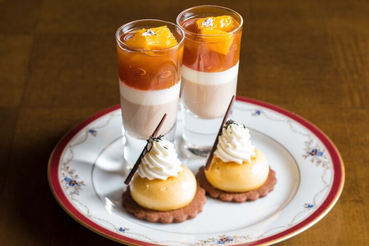 【上段】 アールグレイジュレとミルクチョコプリン、アールグレイとダブルチョコレートムース