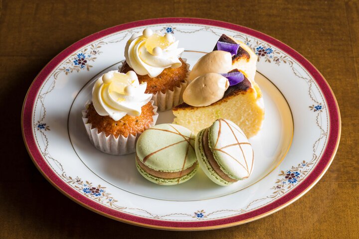 【中段】 紅茶のカップケーキとレモンクリーム、バスクチーズケーキ、アールグレイのマカロン