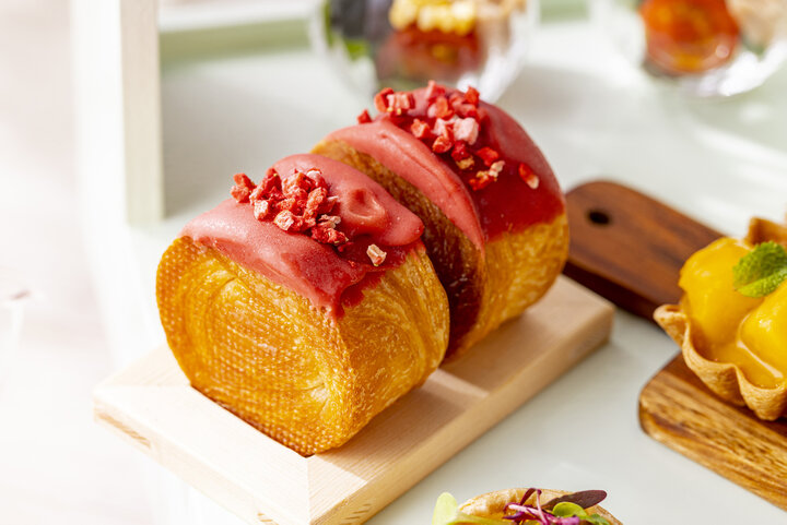 フランスの国旗、トリコロールカラーのスタンドにはパリの春を五感で楽しめるパンが彩りよく配されます。 クリームチーズ入りカスタードにラズベリーを冠した「ラズベリーデニッシュ」やザクザクデニッシュにマンゴーのとろりとした食感が絶妙な「マンゴーデニッシュ」、いちごガナッシュをトッピングしたNYで話題の「シュプリームクロワッサン」に加え、フレンチトーストにアーモンドクリームを乗せて焼き上げ、コーヒークリームをトッピングした「タルティン」など、まるで愛らしいブーケのようなお菓子パンが目と舌を楽しませます。