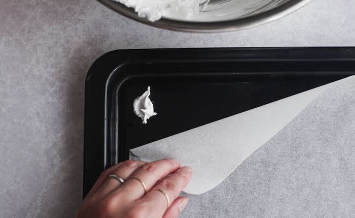 4.天板にオーブンシートを敷く。敷くだけだとメレンゲを置くときにズレてしまうので、ちょっと天板にメレンゲをつけて、シートを接着すると◎。