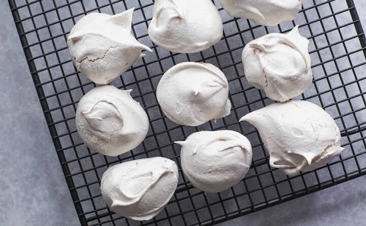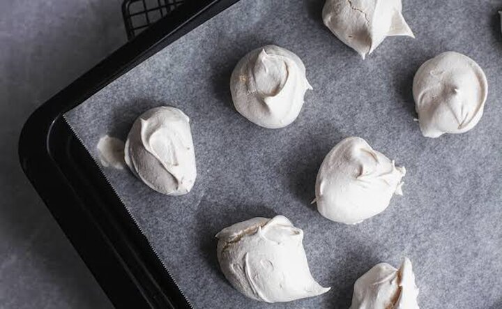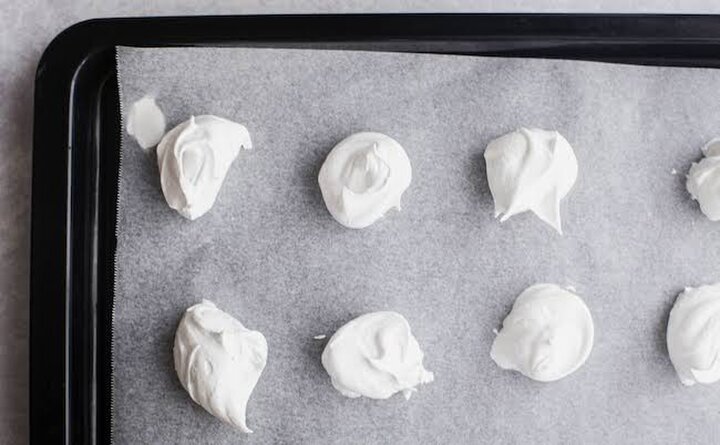 5.スプーンを2つ使って天板にメレンゲを落としていく。つぶして使うので形は気にしなくてOK。天板に落とし終えたら、110℃に予熱したオーブンで1時間半焼く。