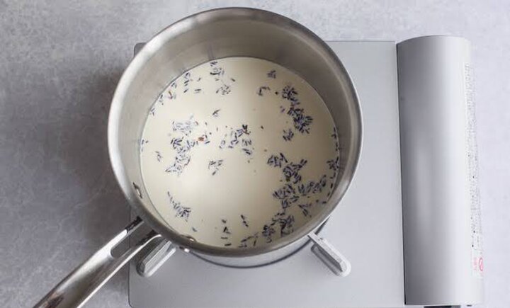 7.メレンゲを焼いているあいだにラベンダー風味の生クリームを作る。生クリームとラベンダーを鍋に入れ、弱火にかける。ふつふつしてきたら火を止め、蓋をして3分待つ。