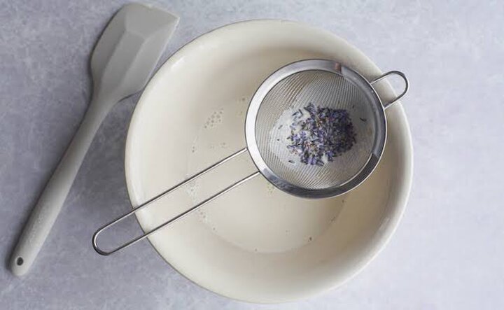 8.3分経ったらラベンダーを取り除き、生クリームを氷水で冷やす。