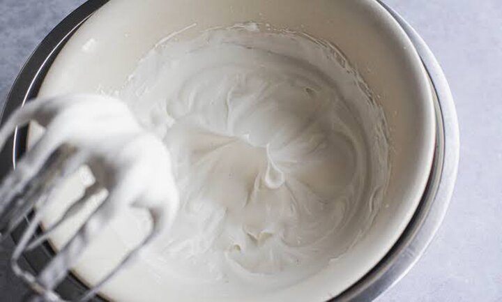 9.生クリームが完全に冷めたら、ボウルの底を氷水にあてながら泡立てる。