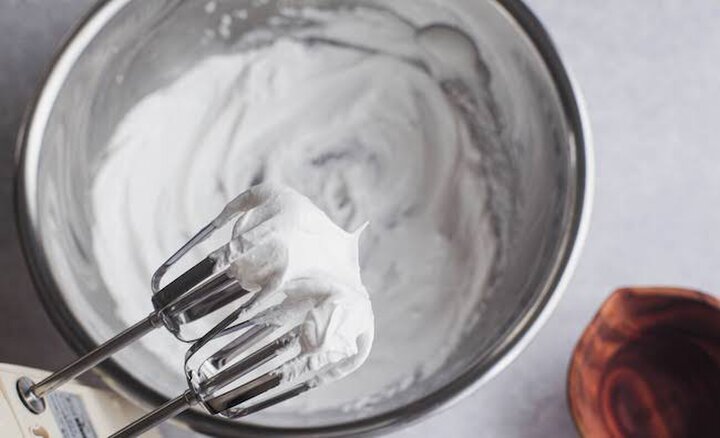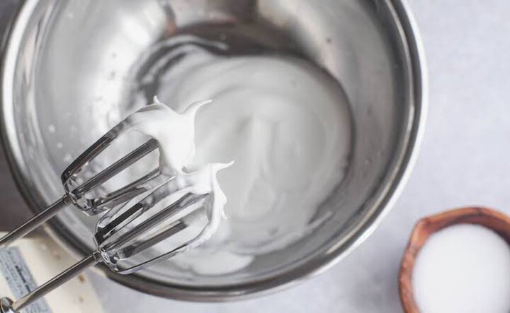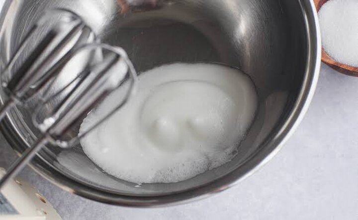 1.オーブンを110℃に余熱させているあいだに、卵白だけでフワッとするまで泡立てる。