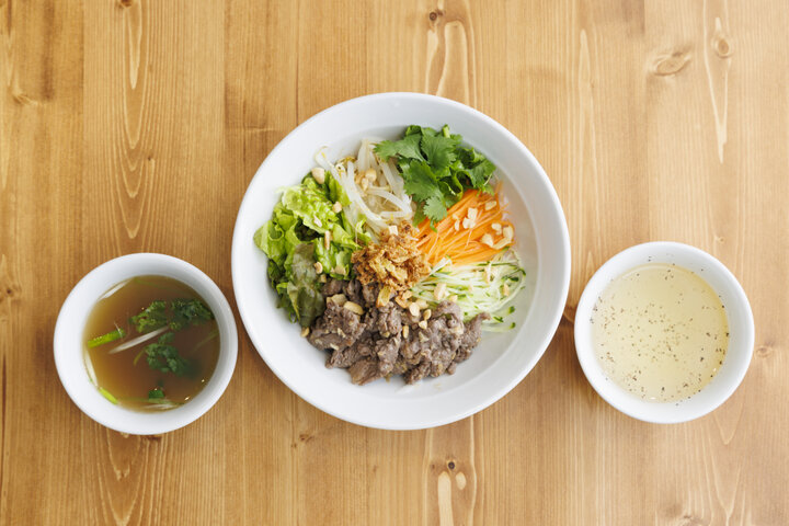 季節の限定メニューも注目です。今夏には、「冷やしの牛混ぜフォー(スープ付き)」(1100円)を提供予定。牛肉ににんじんやきゅうり、もやし、パクチーなどたっぷりの野菜がのったフォーに冷たいスープとライムをお好みでかけていただくさっぱりとした一品です。 店内のメニューはすべて、「牛肉」(250円)や「パクチー」(100円)、「ねぎ」(100円)などの材料を追加で注文できるほか、替え玉(200円)も可能です。消化にいいフォーなのであまり罪悪感なくもりもり食べられるのもうれしいですね。