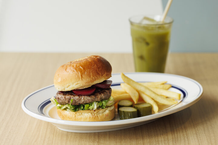 ポテトと自家製ピクルスが付いた「ルーバーガーセット」(2220円)と「キウイジュース」(350円)